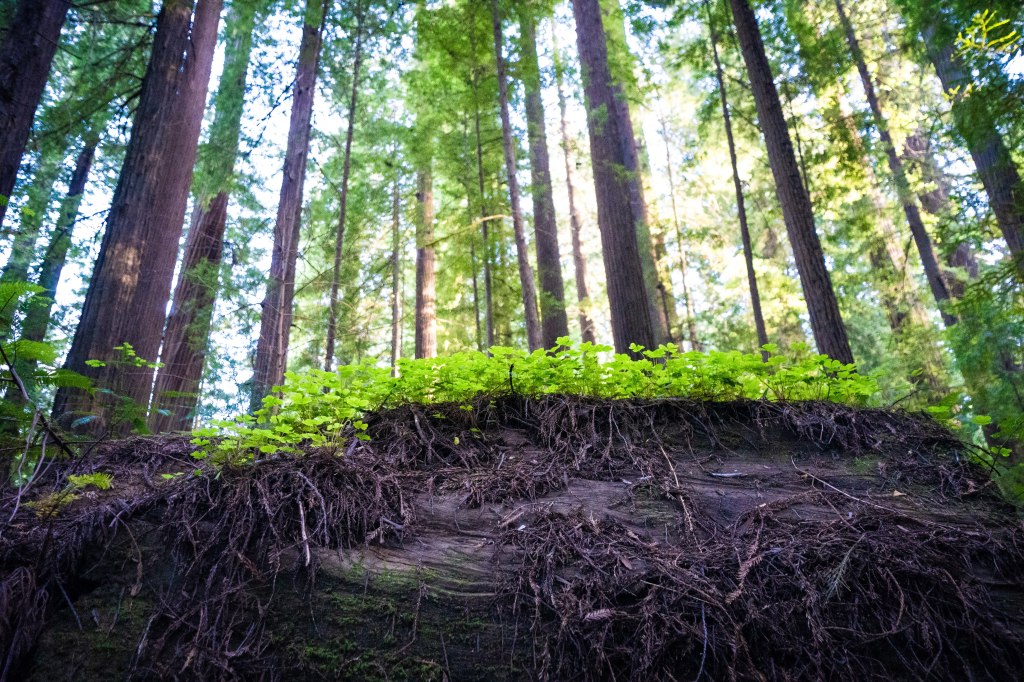 I was hiking through the California coastal redwoods and came upon a fallen giant. The root system alone was massive – way bigger than me. I marveled at it at first, then walked around the side to see the actual tree, which must have fallen many years ago as its topside was completely covered with ferns, trees, clovers, moss. This tree must have lived at least a thousand years and now in death so much life springs forth – a whole new world growing off its back, with many plants and probably insects and other animals living their lives on and around the corpse of this giant.